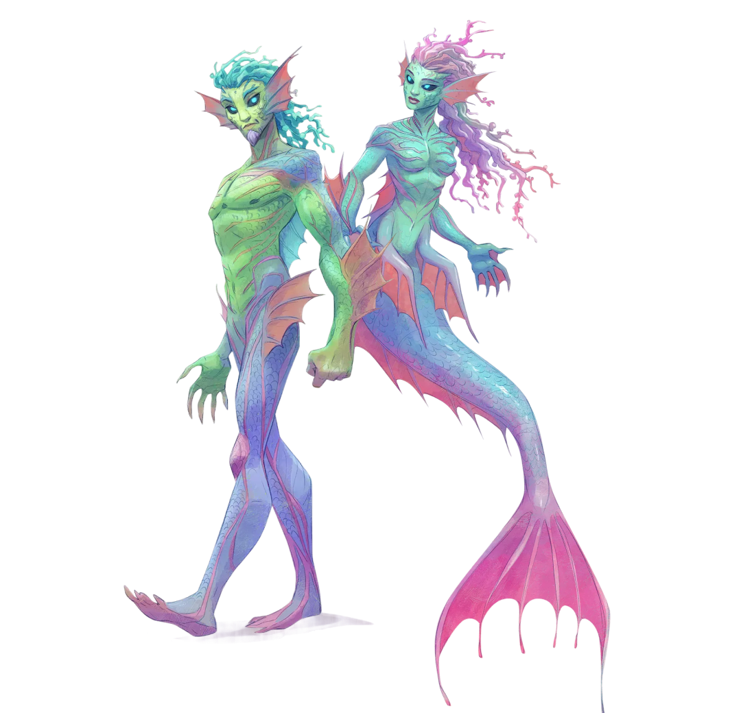 Creature affascinanti con squame iridescenti, orecchie appuntite e capelli simili ad anemoni luminosi. La loro coda può trasformarsi in gambe sulla terraferma. Un tempo recuperavano i sogni dagli abissi e aiutavano Chepi; ora alcuni di loro servono Azimur, trasformando le acque in trappole insidiose.